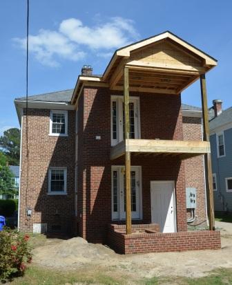 One month later, brick veneer has been applied to the exterior frame, and the rear entry brick stoop and patio areas have been built up. (The addition is barely visible from the street). Exterior stairs (not yet constructed) will provide additional egress from the second floor living unit.