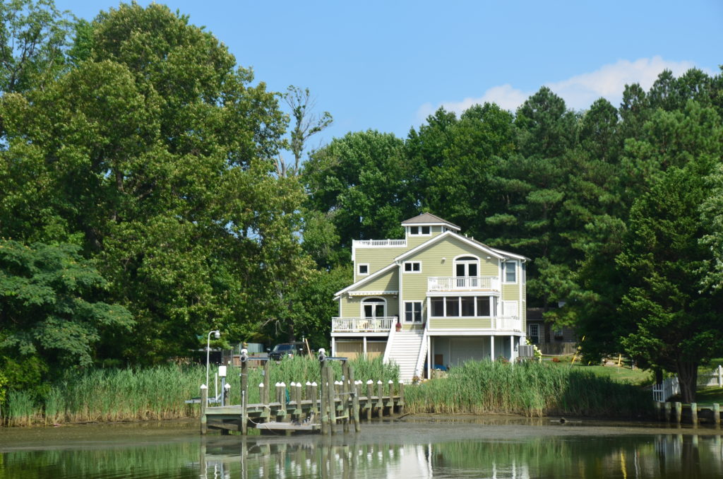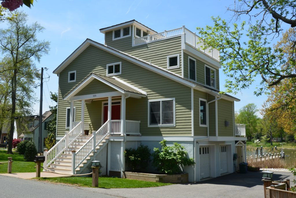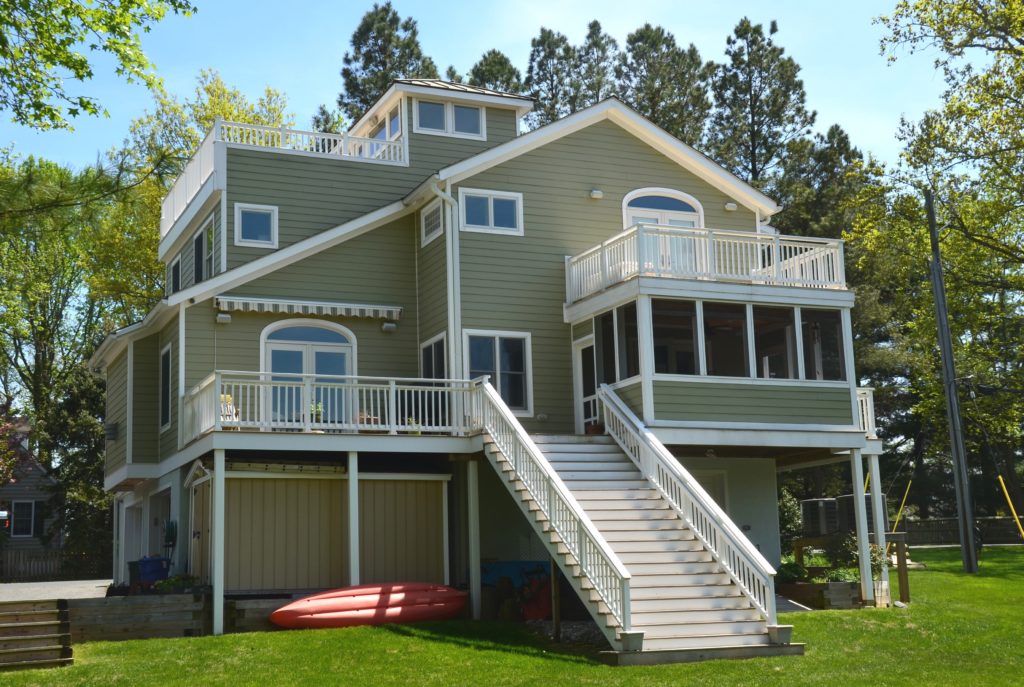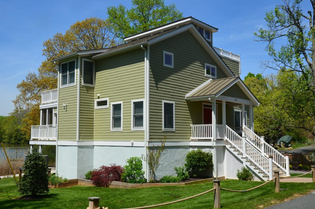 My first opportunity to design a house on a waterfront lot in Baltimore County, MD, occurred in 2008, when I worked with a couple to create a 2,000 square foot, three bedroom house to fit a tight site (actually an undersized lot) on a tidal cove adjacent to Chesapeake Bay, in the Holly Neck area of Eastern Baltimore County. Due to the limitations of the Critical Area requirements, the house was elevated above Baltimore County Flood Elevation guidelines, and limited to a minimal lot area coverage. Owner requirements for a screened porch, open air sundeck, and direct exterior access to a pier were key design elements. Garage/storage only were allowed beneath first floor.